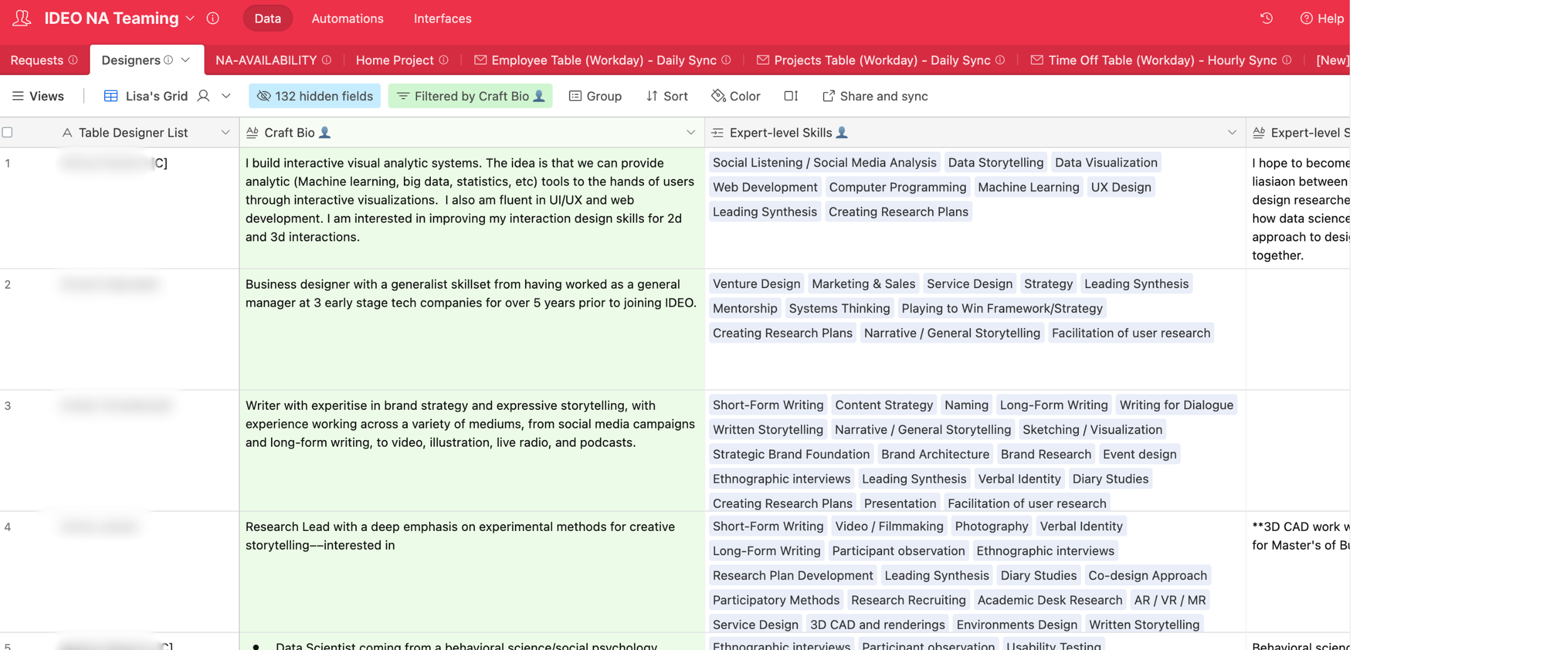 IDEO NA Teambuilders were using multiple database platforms to staff their 200+ designers onto projects. They needed a centralized database to increase accuracy and efficiency so that they can more effectively collaborate both within their own and across other functional teams.