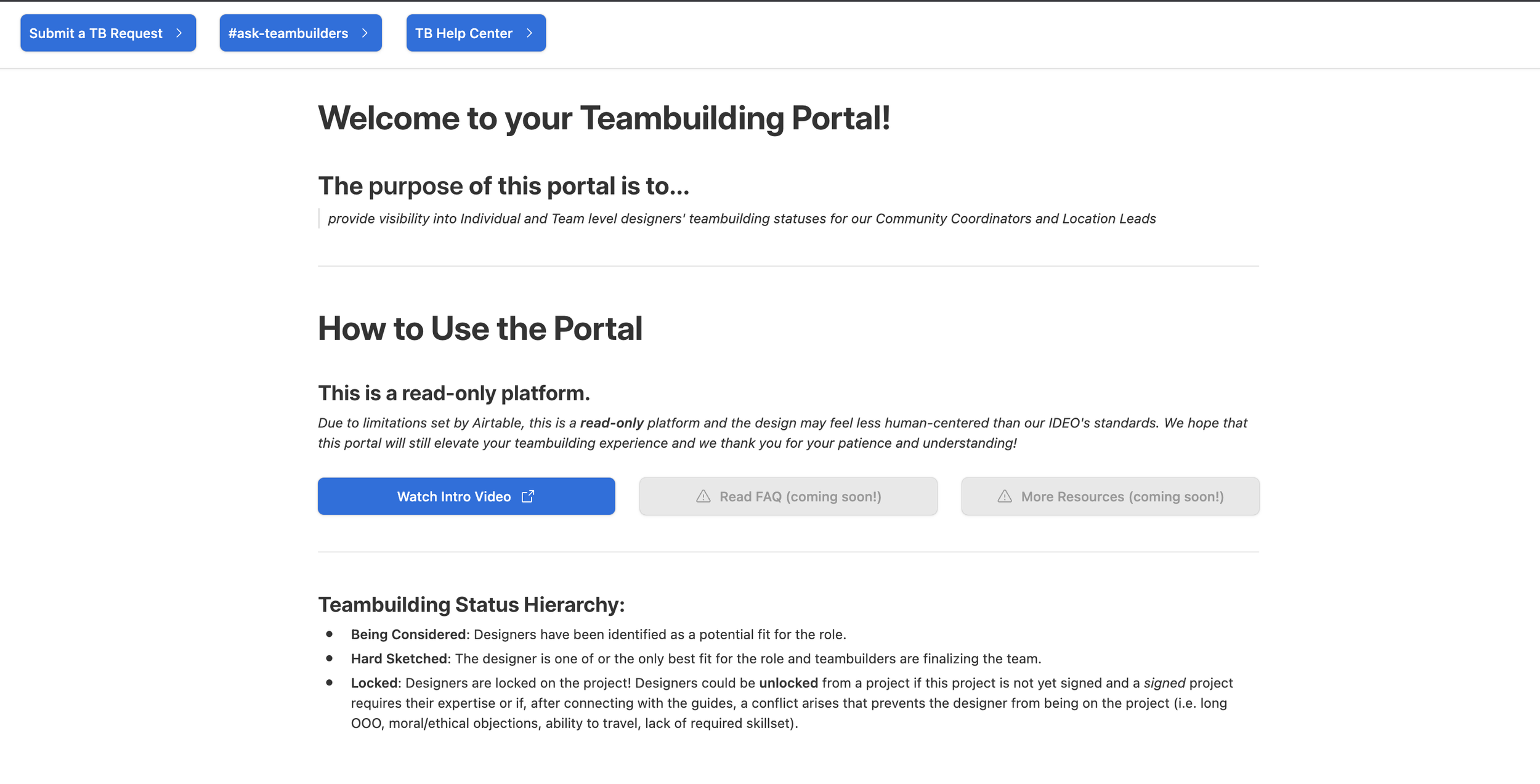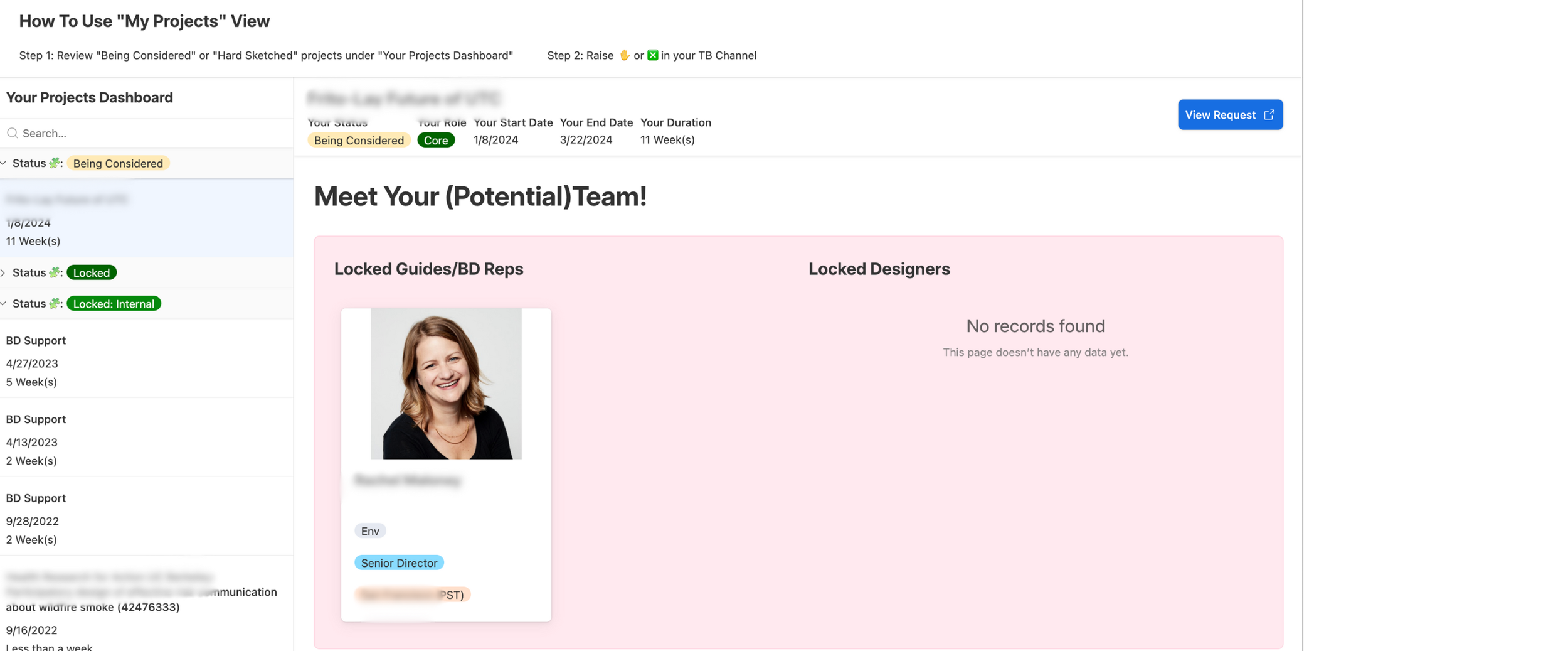 After consolitdating all the data into Airtable, I took the grid views (above) of requests and designer profiles to create interfaces (below) where teambuilders can access all of the data in a more visual and collaborative way.