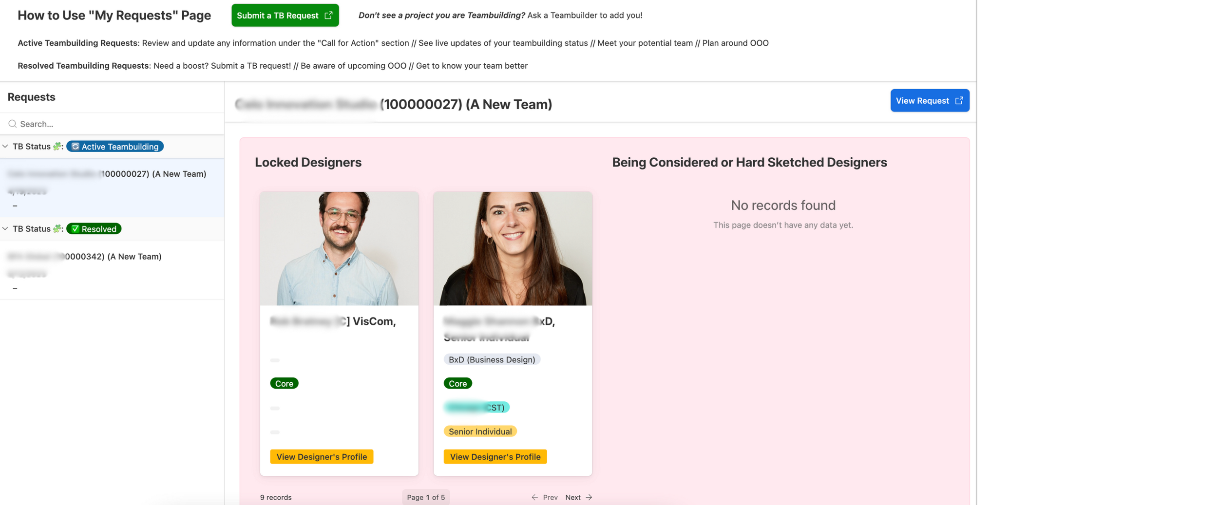 Before, the teambuilding process was ambiguous, but since the creation of these interfaces its process became more transparent and created a space for designers to proactively engage by reviewing and commenting on open and potential requests.