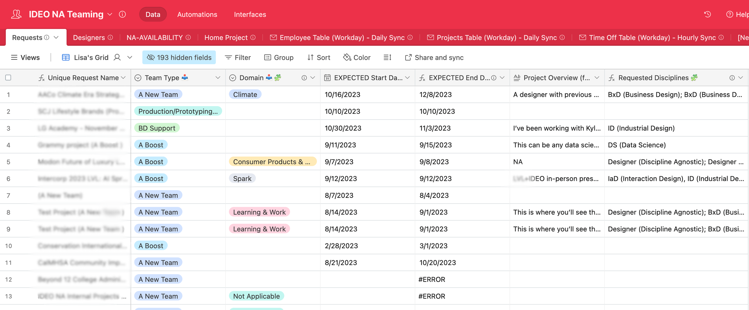 Once the datasource was established in Airtable, it was very easy to create tailored but interconnected interfaces for different teams across IDEO North America to meet their unique needs. While Airtable was only being used in select teams before my arrival, since the creation of these interfaces, Airtable was adopted by the 400+ person North America business unit.